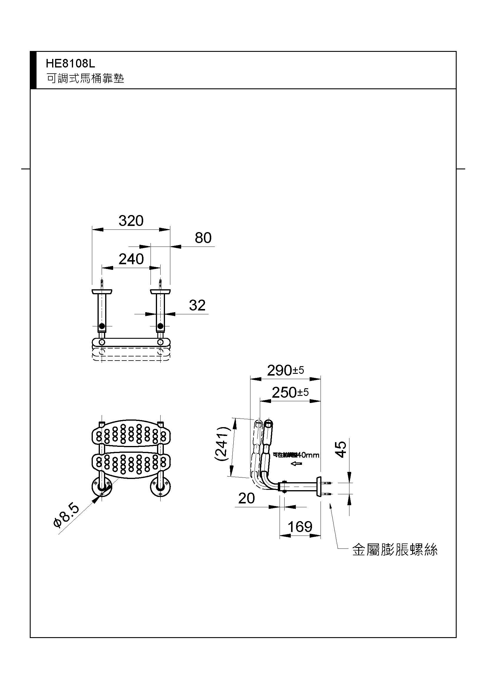 HE8108L:牆面至靠墊前緣 250~290mm